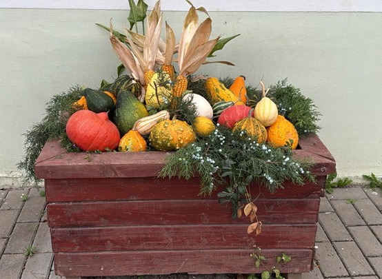 Tak jsme si udělali dekoraci před plotem a v parčíku. Měli jsme radost, že nám letos vyrostly dýně. Loni nám také vyrostly, ale než jsme se nadáli, tak je krysy vylézající z kanálů ožraly tak, že nebyly k použití. Protože obec provedla deratizaci, tak se to letos neopakovalo.